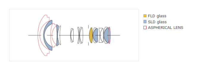 Jedna soczewka FLD (o charakterystyce odpowiadającej fluorytowi) i pięć szklanych soczewek SLD (Special Low Dispertion) z powodzeniem niwelują wszelkiego rodzaju aberracje zarówno w centrum, jak i na brzegach kadru. Trzy soczewki asferyczne, w tym soczewka asferyczna o dużej średnicy z przodu obiektywu, skutecznie zminimalizują efekt komy i flar, zapewniając fantastyczną rozdzielczość w całej rozciągłości kadru. Dotychczasowe powłoki antyodblaskowe super multi-layer coating zastosowano tym razem w połączeniu z nowo opracowaną technologią NPC (Nano Porous Coating)*. Obiektyw zaprojektowano w taki sposób, aby był mniej podatny na negatywne skutki fotografowania pod światło.